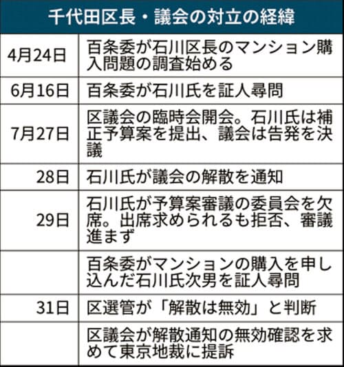東京都千代田区の石川雅己区長と区議会が対立し、区政が混乱している。区議会は石川氏が偽証したとして刑事告発する方針だが、石川氏は議会の解散を通知。区選挙管理委員会は7月31日、「解散は無効」とした。ただ、石川氏は主張を変えておらず、混乱が長期化する恐れもある。